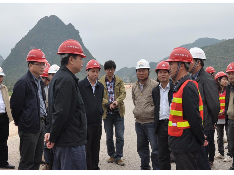 圖3:自治區(qū)交通運(yùn)輸廳副廳長(zhǎng)梁毅(前右一)在欽崇高速公路項(xiàng)目檢查調(diào)研