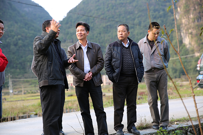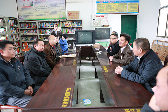 集團(tuán)公司朱堅(jiān)和董事長(左三)、張友坐副書記(右一)聽取駐村”第一書記“梁義寬匯報(bào)工作。 在相堯村、豹山村、才帛村,朱堅(jiān)和董事長分別與當(dāng)?shù)劓?zhèn)、村干部以及覃獻(xiàn)康、梁義寬、蔣博三位派駐農(nóng)村“第一書記”和扶貧工作隊(duì)隊(duì)員進(jìn)行親切交談,詳細(xì)詢問“第一書記”工作、生活情況,并聽取了“第一書記”關(guān)于幫扶村的黨建及村集體經(jīng)濟(jì)發(fā)展情況匯報(bào)。得知目前各駐村書記及扶貧工作隊(duì)員已經(jīng)完成精準(zhǔn)扶貧入戶摸底調(diào)查時(shí),朱堅(jiān)和董事長對“第一書記”到村以來,深入調(diào)查走訪,積極幫助村里理思路、定規(guī)劃、辦實(shí)事,表示充分肯定。