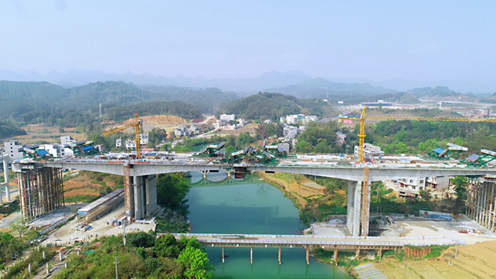 據(jù)悉,巴馬樞紐互通是賀巴高速與河百高速相銜接的一個互通,也是賀巴高速的終點。互通A、C匝道2號大橋長度為532米,剛構(gòu)橋主跨為110米,跨越盤陽河,是都巴高速的控制性工程之一。截至日前,A匝道樁基完成100%、墩柱完成100%、蓋梁完成100%,上構(gòu)剛構(gòu)完成48%;C匝道樁基完成100%、墩柱完成100%、蓋梁完成100%,上構(gòu)剛構(gòu)完成36%。